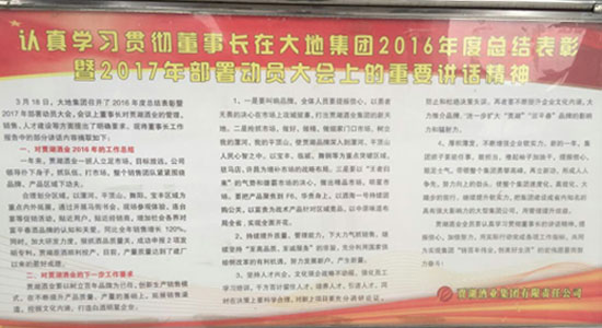 务求实效”的宗旨,各单位结合自身实际,通过座谈会,研讨会,专题会等方式,学习传达董事长讲话精神,吃透实质,找准亮点,让全体员工了熟知新精神,新要求,新目标,新措施,真正把广大干部职工的思想统一到讲话精神上来,更好地落实到实际工作中去, 增强广大员工的忧患意识、危机意识、责任意识和担当意识,为完成全年各项工作任务而不懈努力! 大地公司: 为更好的贯彻落实集团公司2016年年会精神。大地公司结合自身实际,采取专题宣讲、座谈讨论的方式,分层次、分批次、分部门全面开展学习3·18董事长讲话精神,连续多次组织职工学习探讨。针对新一年的工作目标和要求,大地公司总经理赵中要要求,全体员工要对照自身职责,全面领会讲话实质,紧密联系工作实际,围绕集团整体的发展方针与工作要求,结合年初制定的各项工作目标与经济指标,采取强有力的措施,强化时间观念和效率意识,圆满完成全年的各项工作任务。 会上,广大干部职工纷纷表示,要以此次会议为契机,撸起袖子加油干,力争在使各项工作再上新台阶,提升新高度。 贾湖酒业: 3月19日上午,贾湖酒业集团召开中高层领导会议,布置落实学习董事长3·18讲话精神活动。集团常务副总孙耀州要求,集团上下要认真学习和落实董事长讲话精神,并融入到日常工作中去,以更加昂扬的斗志去迎接新的挑战。一是要加大宣传力度,营造浓厚氛围。利用报刊、宣传栏、微信平台等手段宣传讲话精神,使其融入到每个员工的心中;二是各部门要制定详细的学习计划。分步骤、分时间、分批次通过不同的形式进行学习,深刻体会讲话精髓;三是要加强监督落实。成立专门的督查小组,对各部门学习情况进行督查,对学习成果进行抽查,最终达到预定的学习目的。 会后,各部门积极响应,迅速行动,第一时间召开座谈会,研讨会等不同形式的活动,整个集团上下形成了深厚的学习氛围。 集团行政部: 3月23日下午,行政部组织全体办公室人员在中控二楼接待室召开讨论会。办公室副主任黄帅辉首先传达了董事长讲话精神,进一步分析了讲话的重点和亮点,结合自身工作实际,参会人员展开激烈讨论,剖析自身存在的问题和不足。特别是董事长对当前面临的严峻形势与发展机遇的精准分析,以及对今年工作提出先进的发展理念、明确的战略目标、清晰的发展方向,令人精神振奋,备受鼓舞,大家纷纷表示,要提振士气,鼓足干劲,转变工作作风,提高办事效率,更好地发挥参谋助手、综合协调、督办督查、服务保障四大职能,努力做到满负荷,快节奏,优质高效地为集团发展壮大作出积极贡献。 大地公司组织熟料工段员工学习讲话精神 贾湖酒业技术部组织员工学习讲话精神 贾湖酒业制作宣传展板营造学习氛围